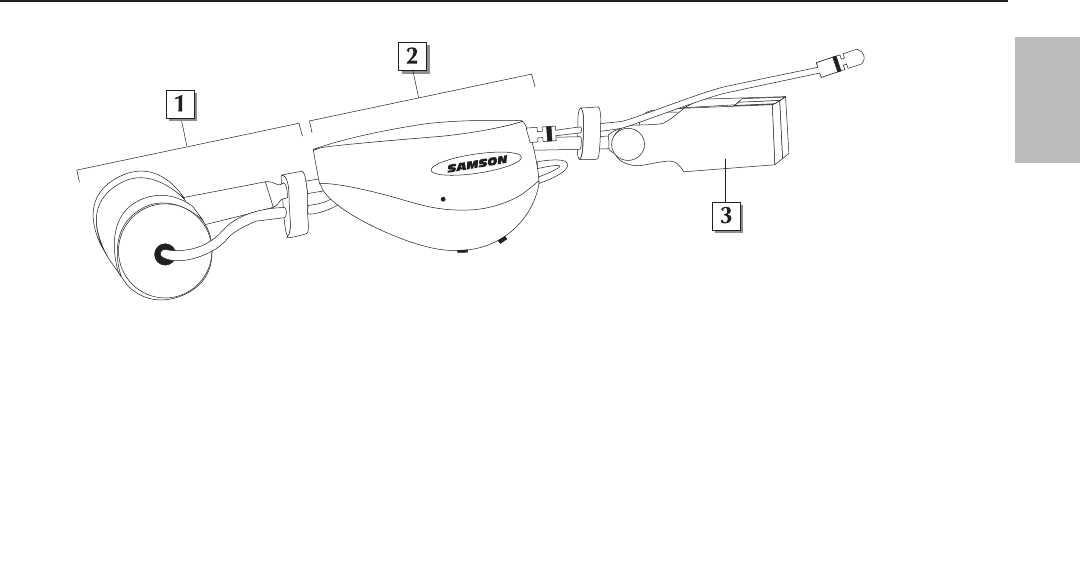 1: Samson HM40 horn microphone - This microphone is “hard-wired” to a Samson AH1 headset transmitter (see #2 below). See the sup-